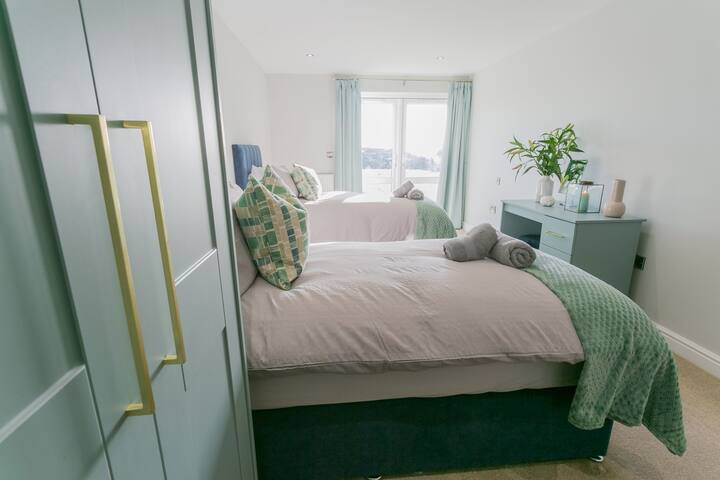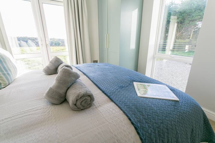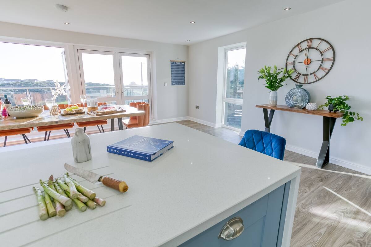 A modern, dog-friendly holiday house for eight, Garreg Hen perches above Trearddur Bay and is located directly opposite the golf club. Turn into the driveway off quiet Lon Garreg Fawr and park up.