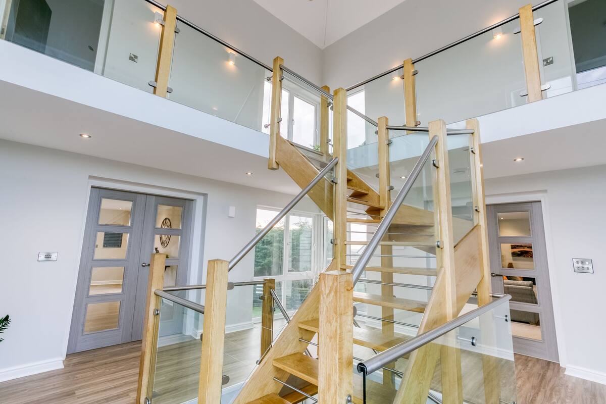 Entry to the house is at ground floor level. Step into the central atrium where a soaring open plan staircase and full-height windows opposite impress. Several rooms lie off this space- the kitchen/dining space, the living room, an office, and a shower room.